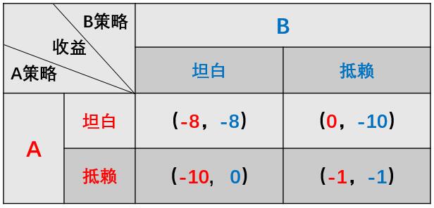 同时B在做策略时,也要考虑A怎么想的,最终也会选择“坦白”策略。