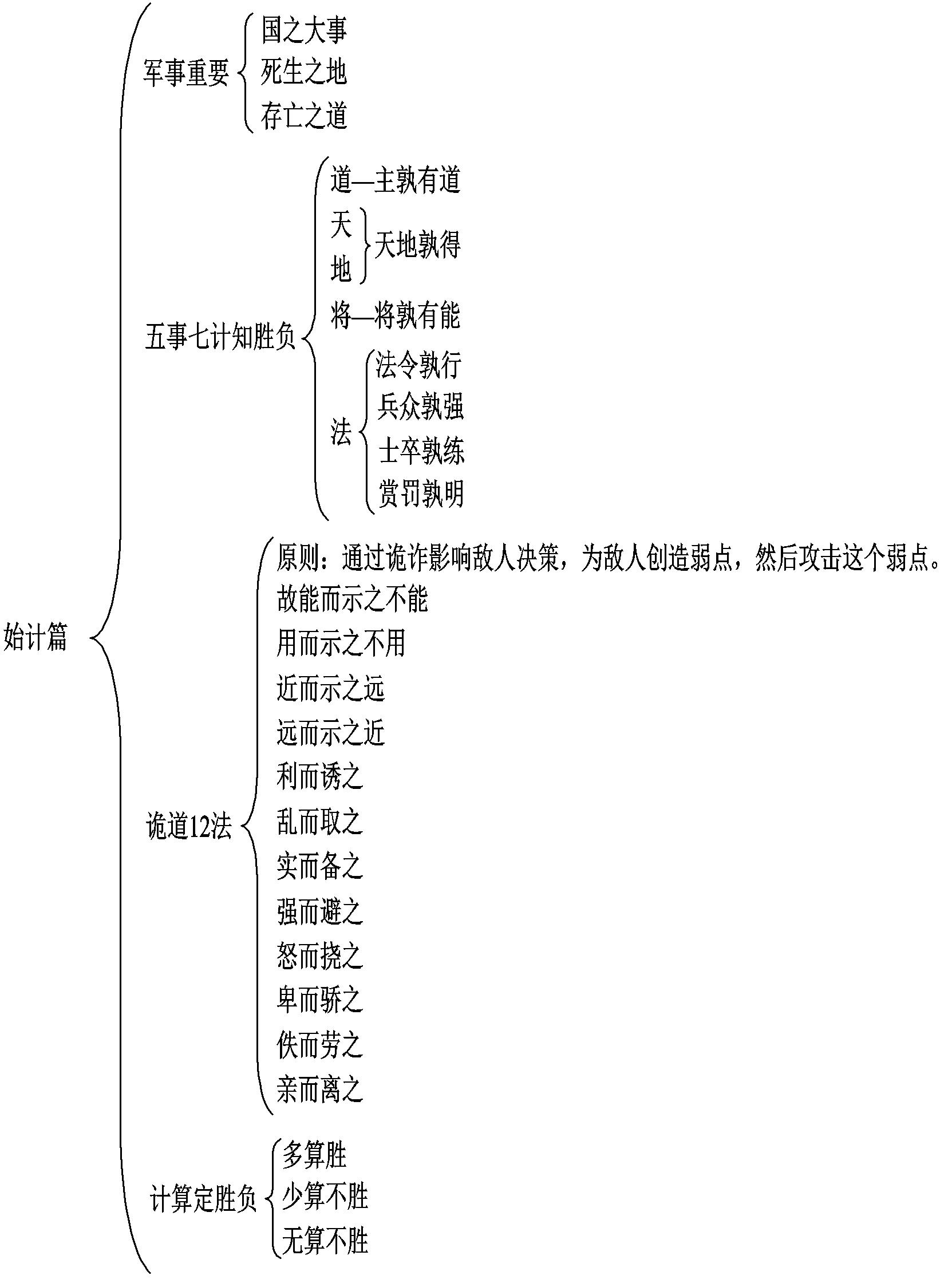 《始计》篇是《孙子兵法》的第一篇,分为四章,第一章讲军事重要,战争与和平时都需要仔细省察。第二章讲五事七计知胜负。第三章讲诡诈12法,诡道的原则是:通过诡诈影响敌人决策,为敌人创造弱点,然后攻击这个弱点。第四章讲先计后战。计算胜者可以战,计算不胜则推迟决战,直到有把握时再决战(如图1所示)。