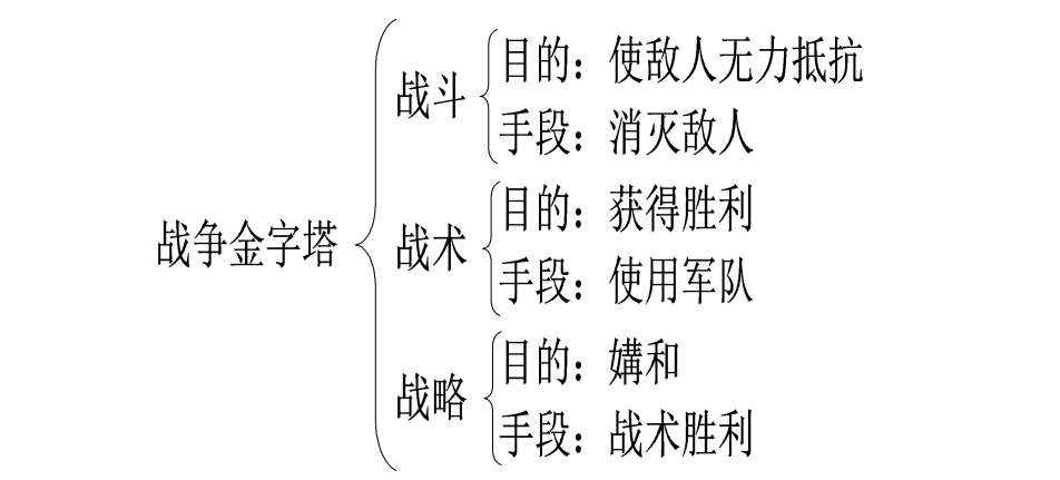 《战争论》中对战争的定义为:战争是迫使敌人服从我们意志的一种暴力行为。战争的目的是通过媾和而获得利益。《战争论》中论述了战争金字塔,分为战斗、战术和战略三层,下层目标是达到上层目标的手段。战斗的目标是使敌人无力抵抗,战斗的手段是消灭敌人;战术的目标是获得胜利,战术的手段是使用军队;战略的目标是媾和,战略的手段是战术胜利。因为战斗的手段是消灭敌人,就关系到军民的生死和国家的存亡,所以战争是国家的大事,需要认真思考和对待(如图3所示)。