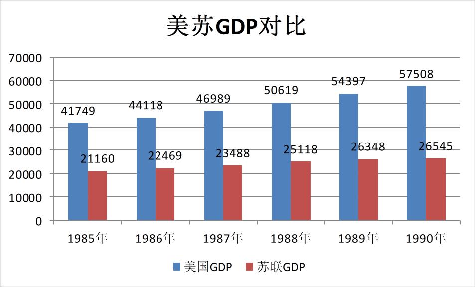 此时,美国的GDP差不多是苏联的2倍。如1985年,美国的GDP是41749亿美元,苏联是21160美元(如图5所示)。