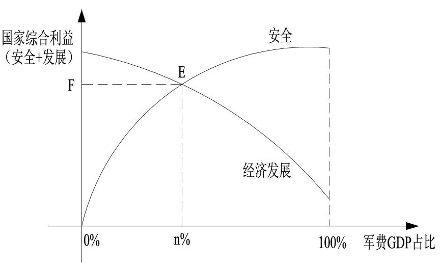 如果国防预算的投入是0%,那么就没有国防,安全等级为0;随着投入的增加,安全性也在增加,当投入是100%时,国防投入最大,安全性最高,所以安全随着国防预算的增加而增加,安全是一条随着预算增加的上升曲线。如果国防预算是GDP的0%,那么资金都可以用来发展国家经济等,经济发展水平最高;随着国防预算的提高,投入经济建设的资金也在减少,经济发展减慢;当国防预算是100%时,经济发展减少到最小,经济停滞。所以经济发展是随着国防预算增加而减少的递减曲线。