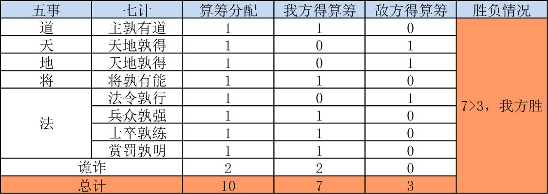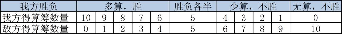 假设用10只算筹对应五事七计和诡诈来计算我方和敌方胜利的可能。10只算筹的分配为:道1只,天1只,地1只,将1只,法4只,诡诈2只,这种分配只是一个例子。如果我方比对方强就得到1只算筹,如果双方实力相同就平分算筹(如图13所示)。