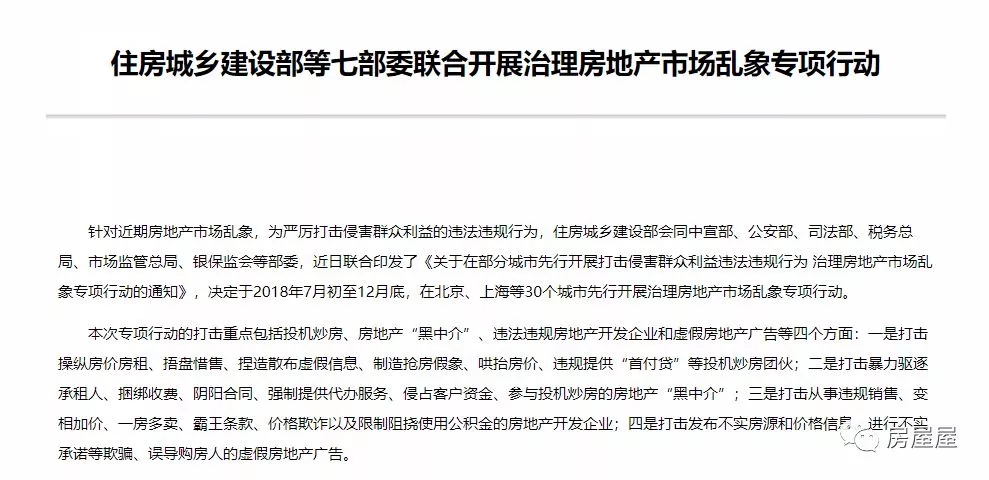 其二,全面打击投机炒房。6月28日,住建部会同公安部、银保监委等7部委展开楼市乱象专项治理行动,北上广深、杭州、武汉、厦门、成都等30城在列。专项行动剑指投机炒房团伙、房地产“黑中介”、违法违规房地产开发企业、虚假房地产广告等四大领域。