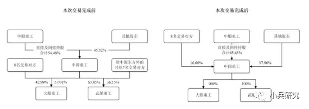 中国重工拟向中国信达、中国东方、国风投基金、结构调整基金、中国人寿、华宝投资、招商平安和国华基金等8名交易对方非公开发行股份,购买其持有的大船重工42.99%股权和武船重工36.15%股权。交易作价219.63亿元,本次交易完成后,大船重工和武船重工将成为中国重工的全资子公司。