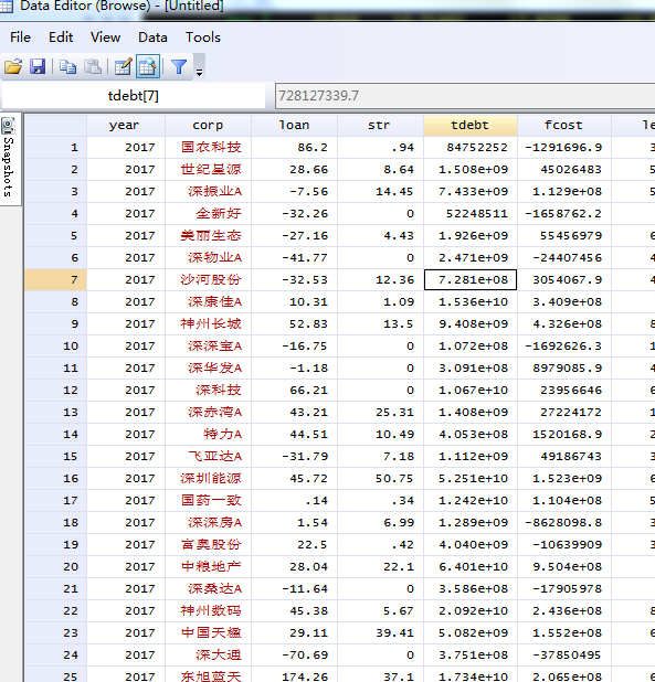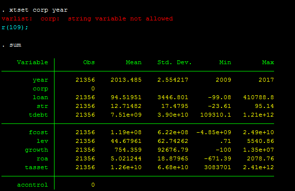 怎样把corp那一栏设置成面板数据,怎样把红字设置成面板数据,而且我sum命令里的凡是汉字数据的都是0