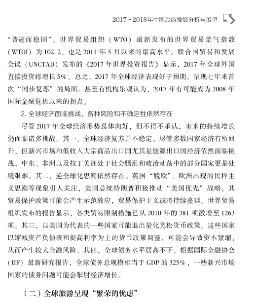 2017 年全球经济温和复苏 , 全球旅游市场全面增长 , 增速继续高于 GDP 增速 , 欧洲反 “ 过度旅游 ” 引发对可持续发展问题的广泛关注 。 2017 年 , 我国全面深化改革进程的推进 , 为旅游发展创造了良好环境 ; 中国特色社会主义进入新时代 ,对旅游发展提出新的要求 ; 旅游及相关领域的改革 , 正在破解困扰旅游发展的一些难题 ; 产业融合趋势在政策推动和产业实践两个层面得到强化 ; 旅游投资热潮涌动 , 部分领域可能存在投资过度的隐患 ; 一系列新标准的出台和实施 , 将引导旅游新兴业态实现健康发展 ; 乡村旅游高潮迭起 , 旅游精准扶贫全面推进 ; 在京津冀 、 粤港澳 、 长三角等区域一体化进程中 , 旅游业仍有较大作用可待发挥 ; 世界性旅游组织 、旅游会议和活动的增多 , 强化了中国与世界的互动 。 2018 年是我国改革开放 40 周年 。 面向未来 , 要进一步推进旅游发展改革和创新 , 发挥旅游作为美好生活风向标 、 社会融合黏结剂 、 深化改革突破口 、 对外开放前沿地 、 区域发展联动机 、现代经济创新者 、 生态文明引领者 、 现代治理折射器 、 人类命运共同体的构建者的作用 , 推动小康社会的全面建成 。