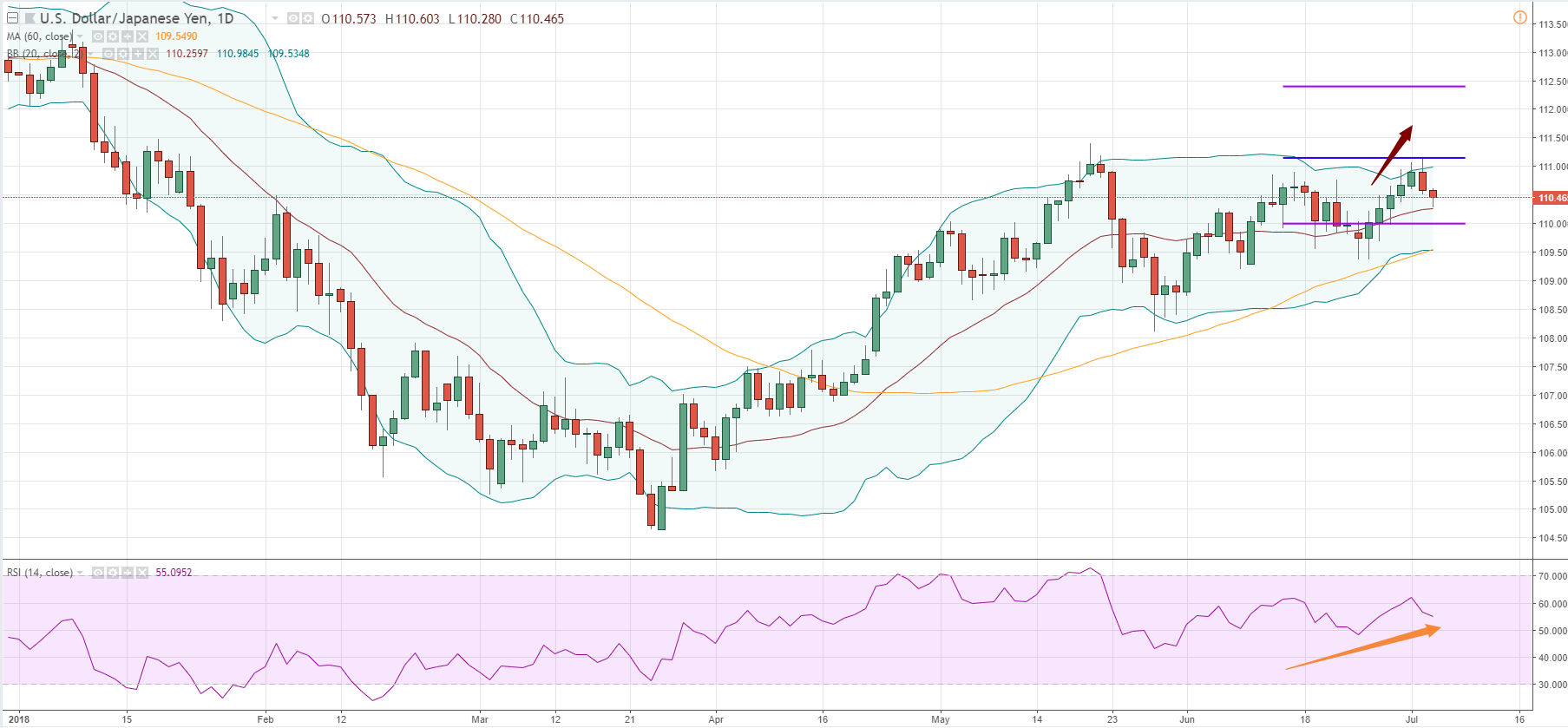 日线图上,美日(USDJPY)的20日平均线在60日线之上达40个交易日之上,证明了中线汇价仍在上升趋势,日图RSI(14)在70之下反映短期汇价并未进入超买区。上周5在汇价突破了5天高位时曾建议做多,近期汇价稍有回落至20日线附近,如进取的投资者可考虑在20日线出现了日图阳线再增加多单仓位,或等待再度突破上周高位111.15时才加多单,目标112.4,止损110。
