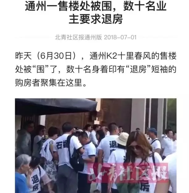 与此同时,北京通州一楼盘因降价,遭数十名业主围攻,要求退房: