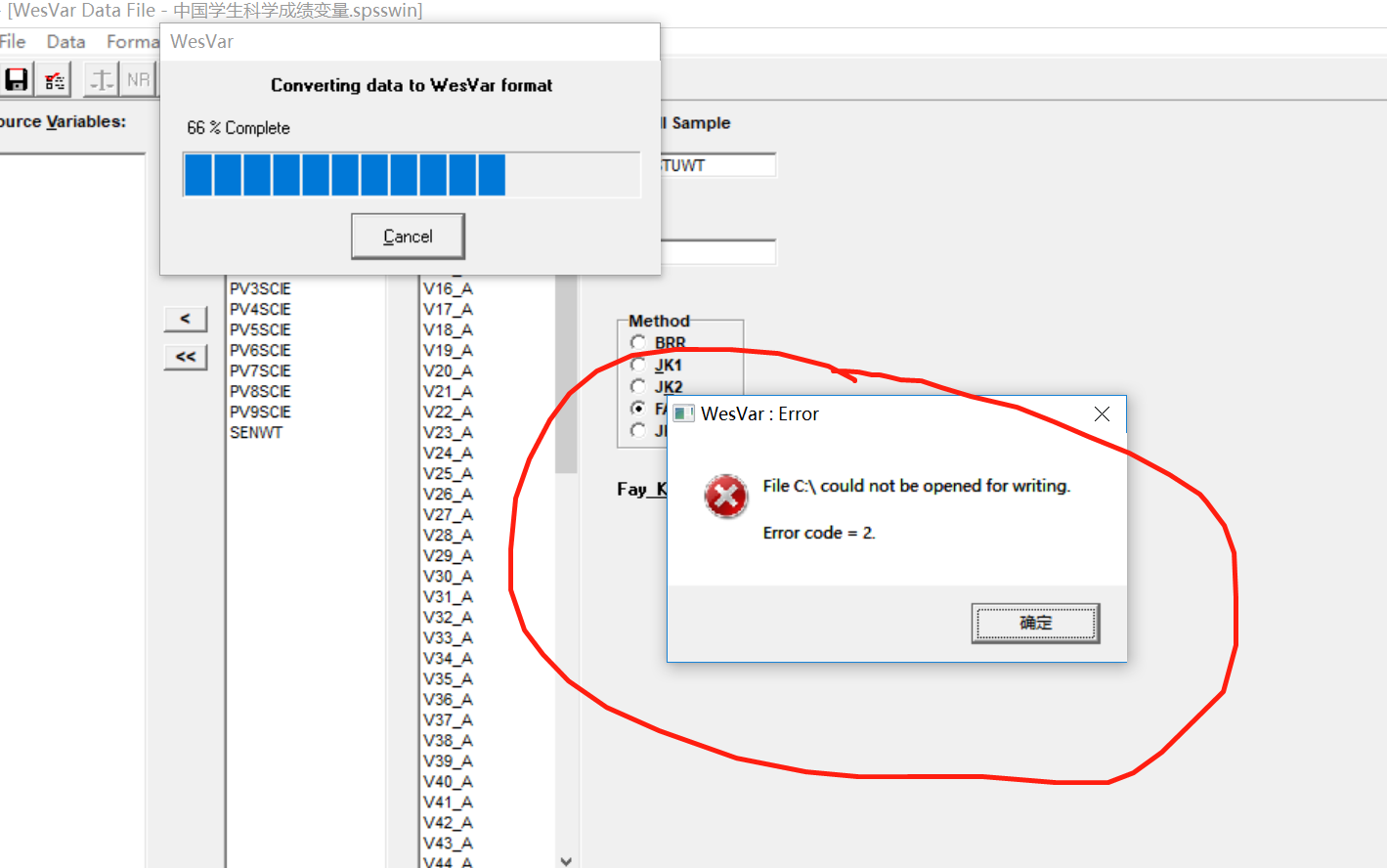 有没有大神用过WesVar软件的?我在使用该软件将.sav的数据保存至.var形式的数据,总是提示我“file xxx could not be opened for writing”。我换了几条存储路径,依旧存在这样的提示。希望能快速解决这个问题,谢谢!