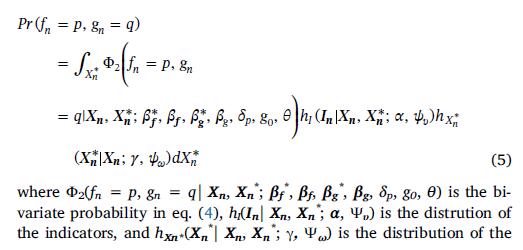 大家好,我是一个刚学习一些基础计量经济学的小白,最近在研读一篇论文,发现他在做bivariate probit model的时候,把隐变量(等式右边)也考虑进去了,如图1所示。我想知道隐变量在做这种模型分析的时候怎么考虑呢?他文中对隐变量做了积分,我就不是很理解,请教一下论坛的各位大神,他的做法的含义,同时有没有相对简单的处理方法?谢谢