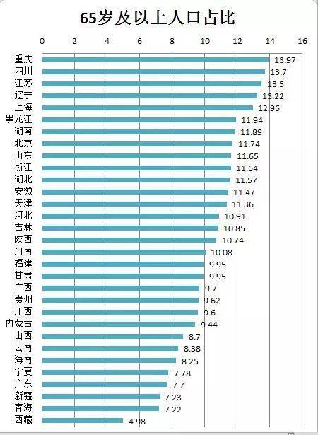 而以上省市的老龄化程度又高于11%的有:重庆、四川、江苏、辽宁、上海、黑龙江、北京、浙江、天津。