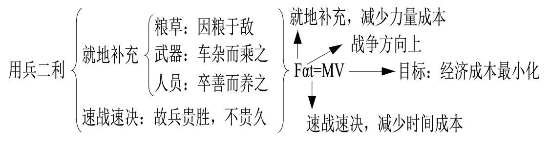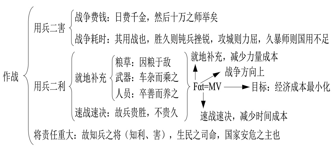 《作战》篇是《孙子兵法》的第二篇,分为五章,主要讲:战争费钱,速战速决,降低经济损失。前两章讲战争二害:费钱和耗时,第三和第四章讲战争二利:就地补充和速战速决,它们是费钱和耗时的解决方法。第五章讲将领责任重大,知道二害和二利的将领,才能保证民众和国家安全(如图1所示)。
