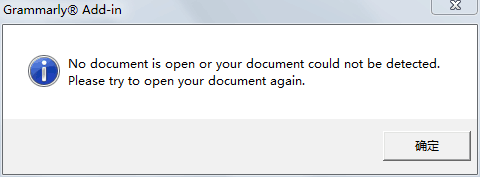 grammarly在word中打开弹出对话框提醒”No document is open or your document could not be detected. Please try to open your document again.“。然后,不能看到语法检查等的错误提醒。
