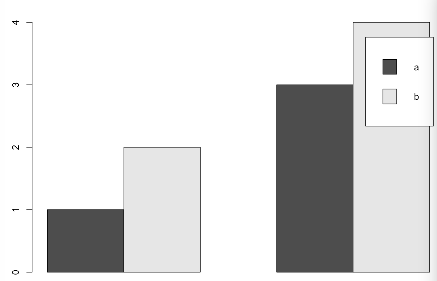 barplot(matrix(1:4,nrow = 2,ncol = 2),legend.text=c("a","b"),beside = TRUE)