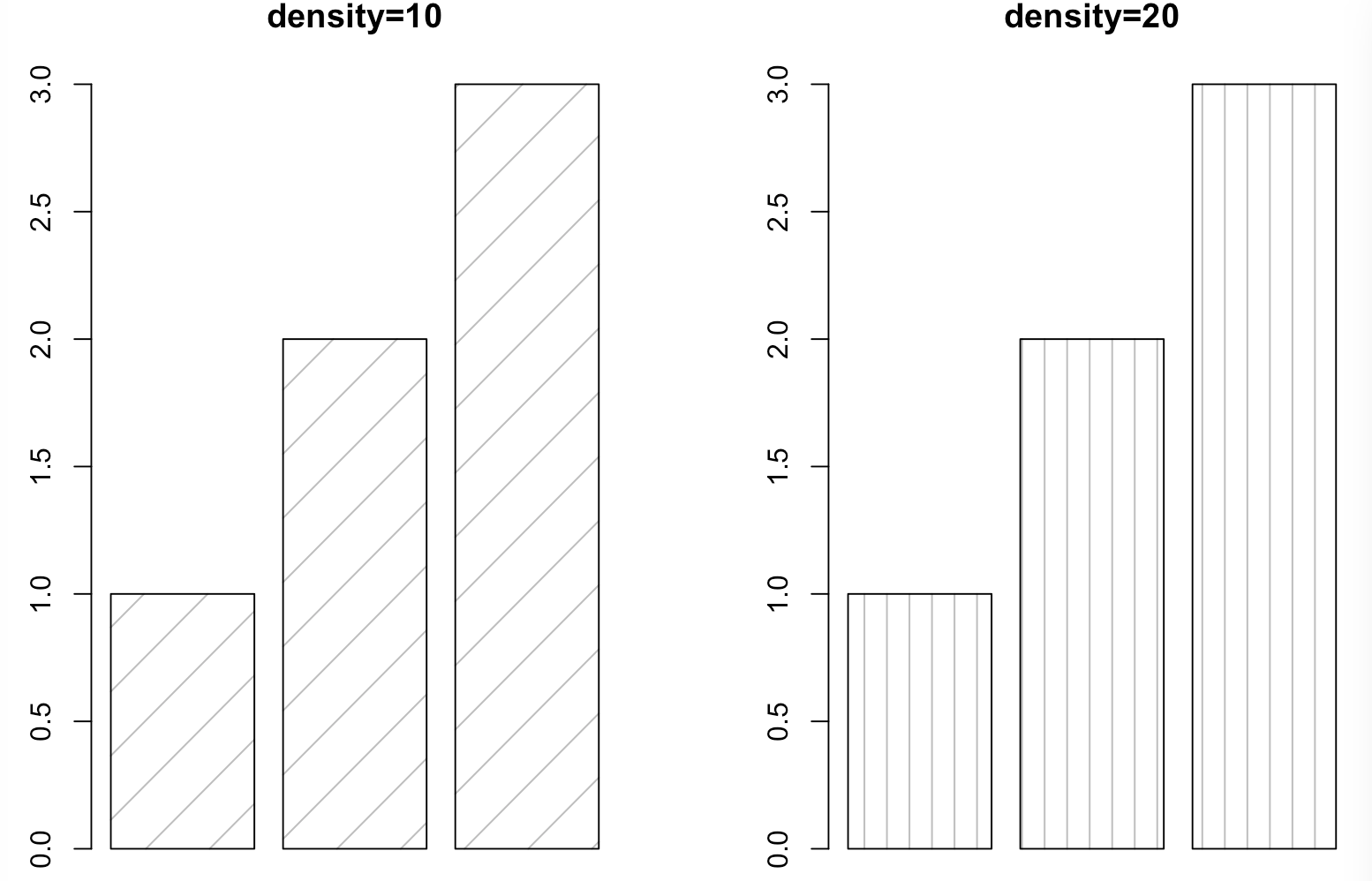 barplot(c(1,2,3),beside = TRUE,density=20,angle=90,main = "density=20")