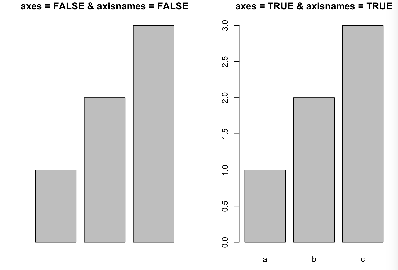 barplot(c(1,2,3),beside = TRUE,axes = TRUE,names.arg=c("a","b","c"),axisnames = TRUE,main = "axes = TRUE & axisnames = TRUE")