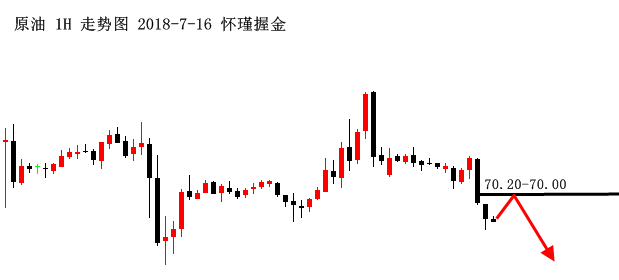原油:原油自上周大跌4美金之后,油价就进入了盘整阶段,虽然上涨一波冲高,但尾盘收盘还是回落到了70.70附近,还是弱势行情,今日亚盘震荡下行,欧盘突然加速已经击破了前一次的起涨点70.00,所以今日晚间空对待,操作上,回撤70.20-00空!
