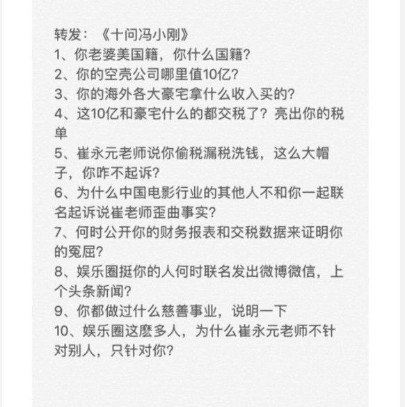 这次反击是借助网友之手,主要是网友写稿崔永元征稿,从这张图来看,这篇文章的主题叫十问冯小刚,很明显是针对冯小刚昨天的十问。冯小刚昨天的十问主要是针对崔永元的道德问题,但是这崔永元的十问,问题涉及面就广了,其中随便一条没解释清楚就很严重。