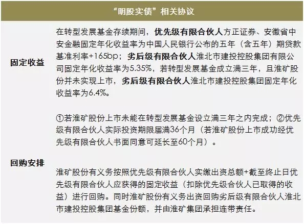 1)本次转型发展基金以“明股实债”的方式增资是淮矿集团市场化债转股总体方案的一部分,总体方案是在国务院和省政府关于债转股相关文件指导下进行的,国务院支持企业按照市场化导向,法制化原则开展债转股本次方案已得到政府和国资委批复认可;