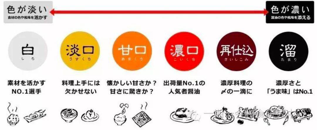以颜色由浅至深来排序,日本的酱油种类依次为:白酱油—淡口酱油—甘口酱油—浓口酱油—再仕入酱油—溜酱油,其中浓口酱油占据了80%以上的市场份额,其次是淡口酱油,大约占总量的15%,至于其它几种酱油种类,加起来市场份额也不到5%