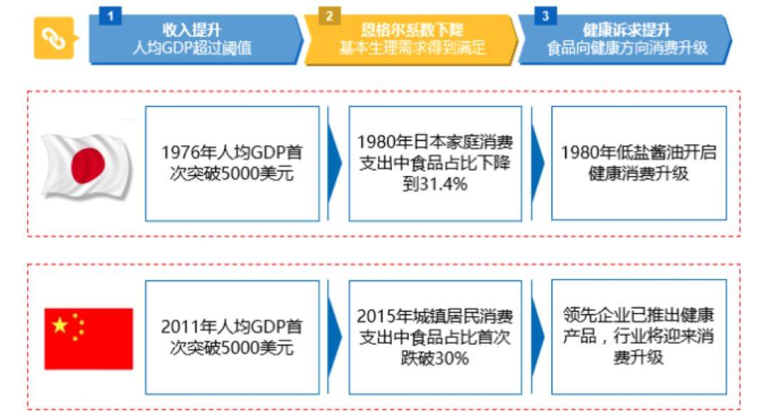 根据马斯洛需求层次理论,在收入提升后消费者最底层的生理需求增长开始放缓,食物等基础支出在消费支出中的占比将逐渐减少。消费者转而积极寻求更高层次的需求,如健康方面的需求。其中典型的表现之一就是消费者开始注重饮食健康,食品向健康的方向进行消费升级。调味品方面,“低盐健康”的概念逐渐普及,日本家庭的食盐平均消费量在1978年~1991年明显下滑,从5100克降至3000克水平。随后,这一概念被应用于酱油制造领域。