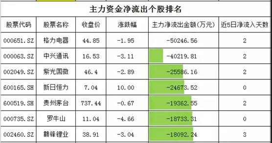 净流出的个股中,白马股和问题股净流出金额居前,格力电器净流出超过5亿元,中兴通讯净流出超过4亿元,紫光国微净流出超过2.5亿元。问题股新日恒力涨停,但资金净流出超过2.4亿元。