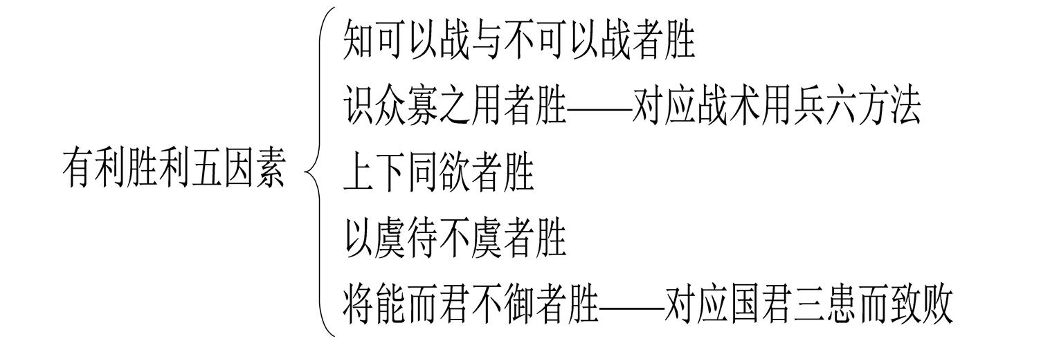 在有利胜利五因素中,识众寡之用者胜对应的是战术用兵六方法;将能而君不御者胜对应的是国君三患而致败。知可以战与不可以战者胜对应的是《地形》篇中的知己知彼知天地;上下同欲者胜对应的是《始计》篇中五事的“道”;以虞待不虞者胜对应的是《兵势》篇中的“以奇胜”,奇袭就是以有准备之师打击敌人无准备之师。