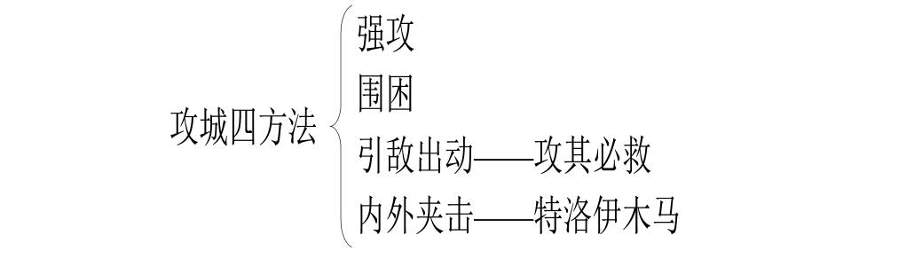 攻城除了孙子所说的蚁附之的强攻外,还有其他几种方法,包括围困,引敌出动和内外夹击等(如图4所示)。