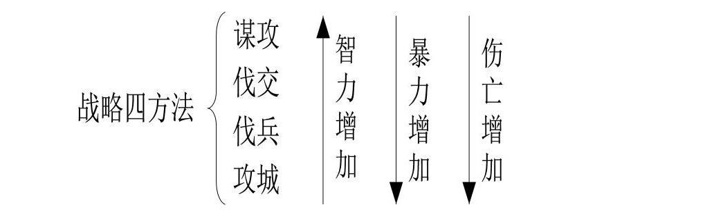 第二章论述了四种战略方法,分别是谋攻、外交、伐兵和攻城。最好的手段是谋攻,其次是外交,再次是伐兵,最后是攻城(如图3所示)。