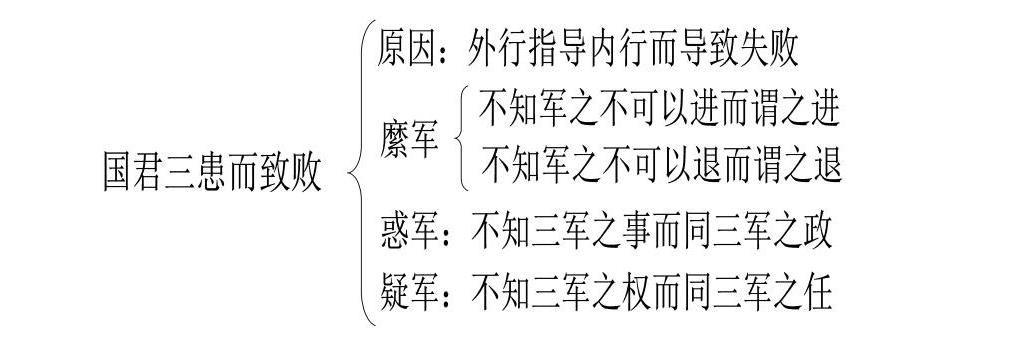 夫将者,国之辅也,辅周则国必强,辅隙则国必弱。故君之所以患于军者三:不知军之不可以进而谓之进,不知军之不可以退而谓之退,是谓縻军。不知三军之事而同三军之政者,则军士惑矣。不知三军之权而同三军之任,则军士疑矣。三军既惑且疑,则诸侯之难至矣。是谓乱军引胜。