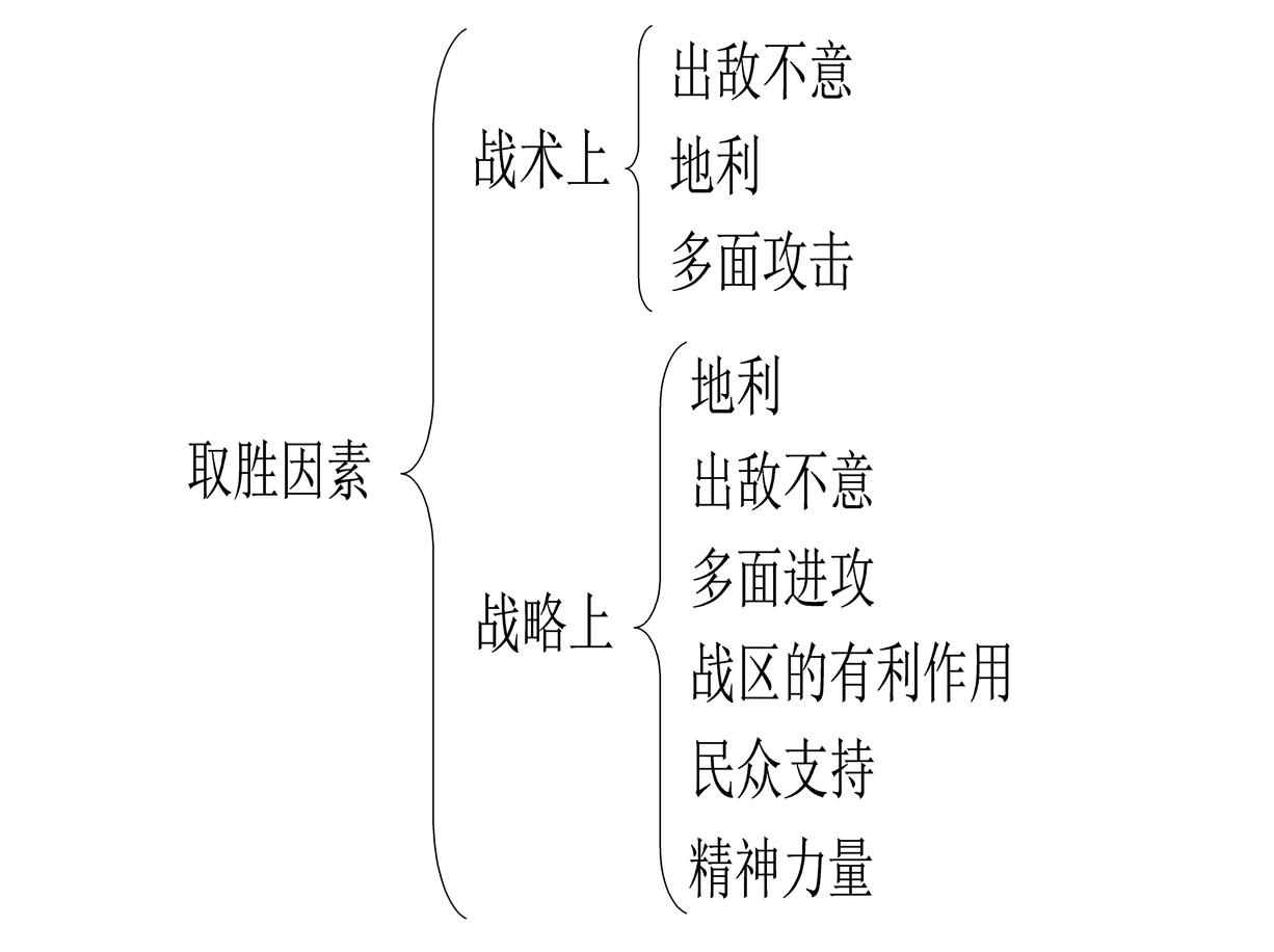 孙子给出了5条有利胜利的因素,克劳塞维茨在《战争论》中分别给出了战术上和战略上有利于取胜的因素,战术上包括出敌不意、地利和多面进攻;战略上包括出敌不意、地利、多面进攻、战区的有利作用、民众的支持和精神力量(如图8所示)。