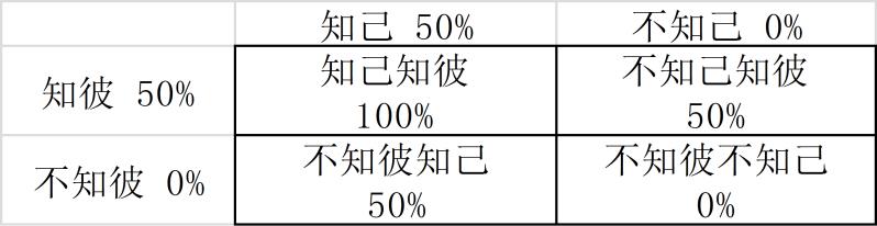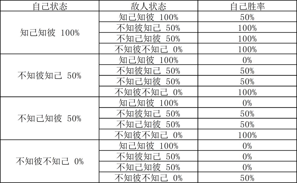 自己的状态和敌方的状态会有16种组合,当自己的状态等于敌方状态时,双方胜率各50%。当自己状态大于敌方状态时,自己的胜率是100%。当自己的状态小于敌方时,自己的胜率是0%。即使自己一方不知己不知彼,那么也不一定就会失败,因为对方也可能是不知己不知彼,所以战争是一种竞赛,不仅取决于自己的状态,还取决于对手的状态。其中100%和0%的胜率只是为了方便理解,现实中不会存在100%胜利的概率,因为还有偶然性。