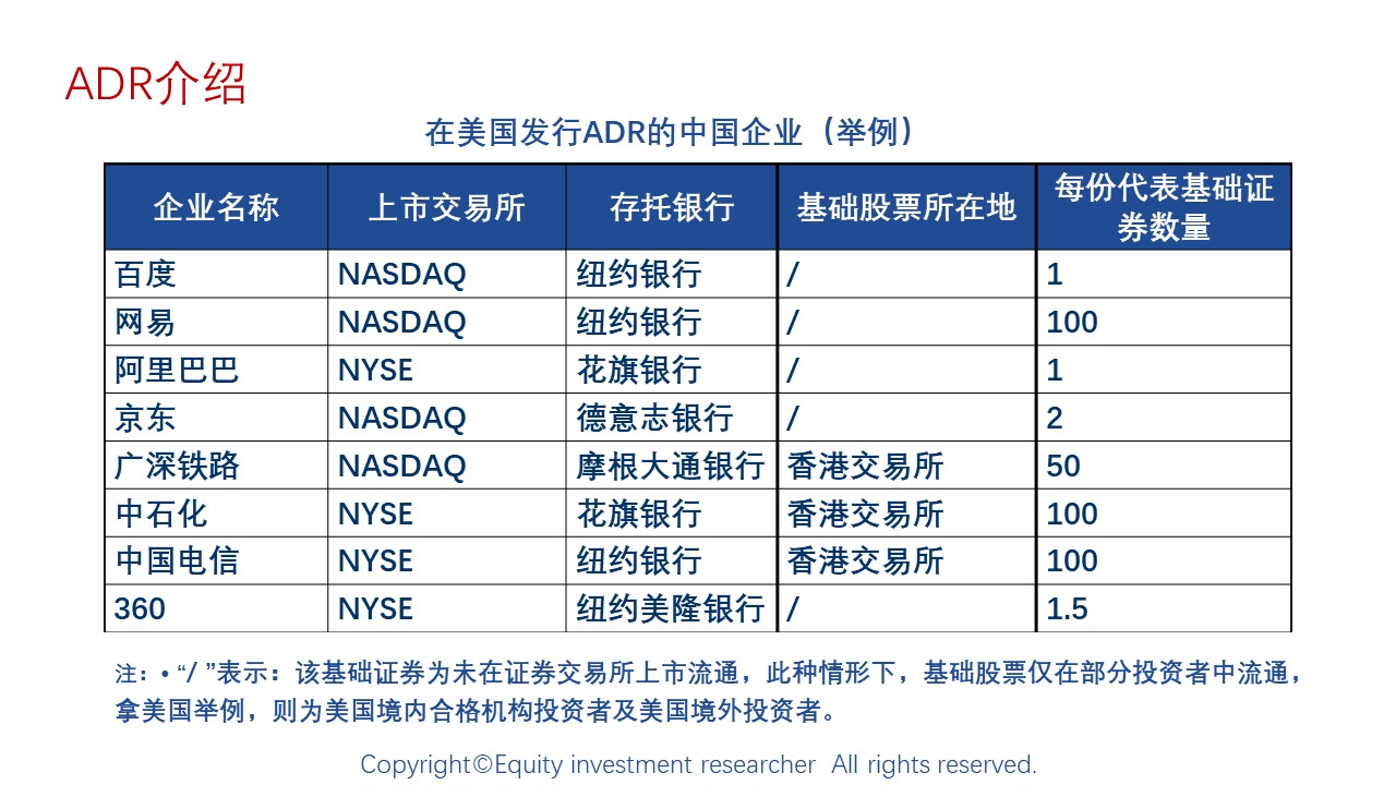 • ADR的流行原因:根据美国政策,不允许在美国境外注册的企业直接在美国上市,而如果选择在美国注册公司再直接上市的方式,时间久、成本高、要求多、程序麻烦,因此大量境外公司选择间接上市的方式,即通过美国本土存托机构发行ADS(也可称“发行ADR”)上市。