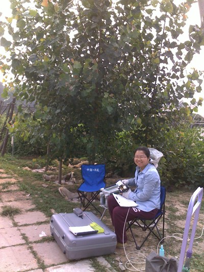 在京郊的一小片杨树林,王欣、刘玲莉为植物打造了“加护病房”。粗细电线蜿蜒在林间土地,连接着大小仪器。光合测定仪则像手术时放大观测的摄像头,时刻记录着叶片的光合速率。观测树木体液流动的导管深入树干,打点滴似的。林边一排漏斗记录着降雨量,高高悬挂的探头则关注着阳光的强弱。