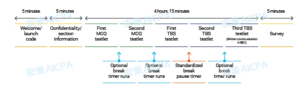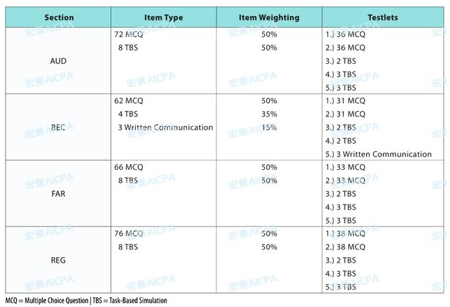每个科目考试部分分为五个较小的部分,称为Testlet。这些Testlet题型选择题(MCQs)和基于任务的模拟(TBSs)。其中BEC科目,还包括有三个书面表达题(written communication tasks)。而MCQs和TBSs的数量取决于具体的测试科目。在AUD,FAR和REG科目测试中将有至少一个研究型问题(research-oriented TBS)。要完成它们,考生必须搜索相关的权威文献并找到适当的参考。