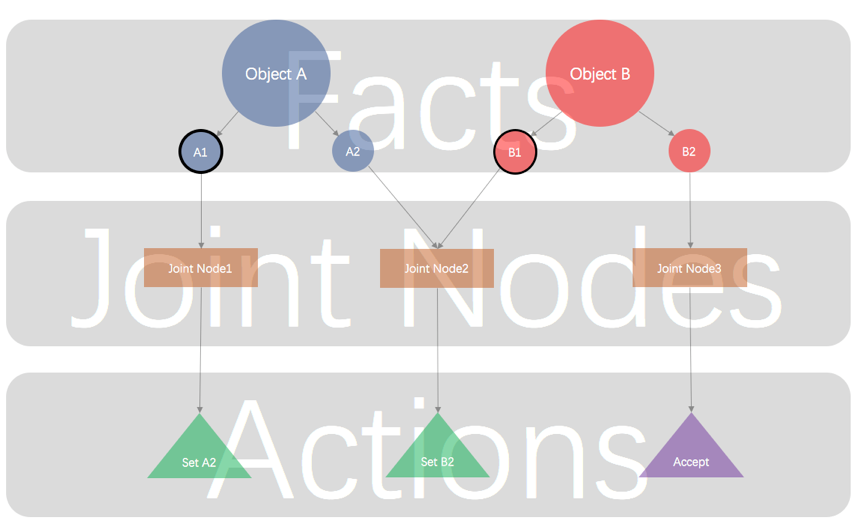 图1是Rete算法的工作原理示意图,可以看到规则运行所依赖的条件以属性的方式存在于数据对象之下。例如ObjectA可以是申请人,而A1则可以是年龄,并且这些属性是可以被多条规则复用的。Joint Node则负责把多个属性连接起来,指向某个具体的行动,这个行动的内容可以是任意的内容;其触发则是由其依赖的属性变化引发的。