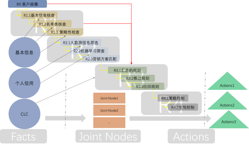 通过规则引擎,CLC的每一个子逻辑块都可以视为一个小型的Rete网络,把这些网络连接起来就形成了完整的风控规则系统。如图2所示,CLC中逻辑块所依赖的事实存放在基本信息、个人信用、CLC等对象的属性中,Rete算法根据规则的依赖关系编译生成Rete网络,有效的执行和管理规则。逻辑块的执行也不总是完全按照顺序进行,例如R1.1基本信息核查出错,那么就没有必要进行后续的检查(节约时间或者查询数据的费用),图中的红线就是代表这种异常的跳转。可以看到,CLC的逻辑块最终和Rete算法中的数据对象、连接节点(Joint Nodes)联系起来,最终产生了行动(Actions),这意味着CLC中蕴含的业务逻辑的完美落地。