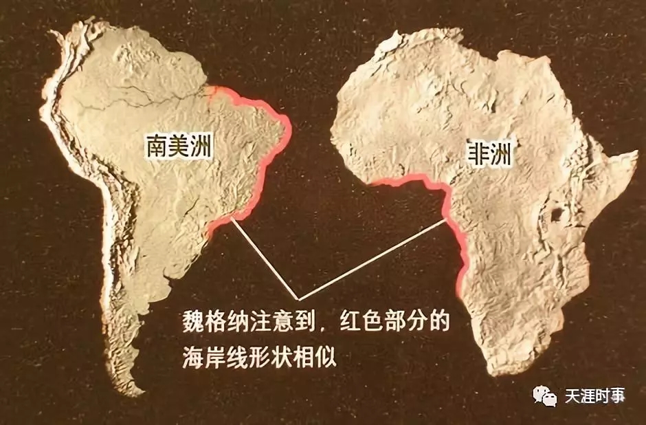 第一,在世界地形图上,北美洲、南美洲的东侧个非洲的西侧似乎能够完全的互补上(红线)。