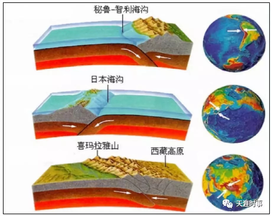 比如青藏高原就是印度板块和亚欧板块相撞所形成的,大家可以看下面的这个示意图。