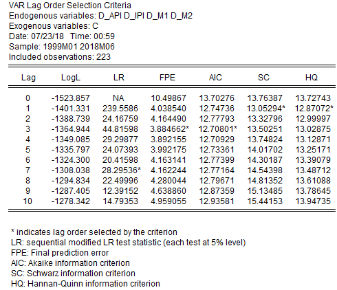 胖胖小龟宝 发表于 2018-7-23 12:08 根据AIC选择最小的(也就是带*号的) 比如滞后期数可以考虑3 然后看下该滞后期模型的拟合度是否好