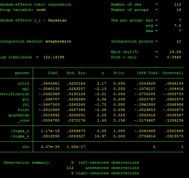 hausman re fe, equation(1:1) //Hausman检验,若p值显著,选择面板固定效应Tobit
