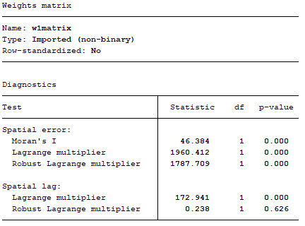 然后通过spatdiag,weights(w1matrix)检验之后的结果是这样,是可以做空间计量模型的。