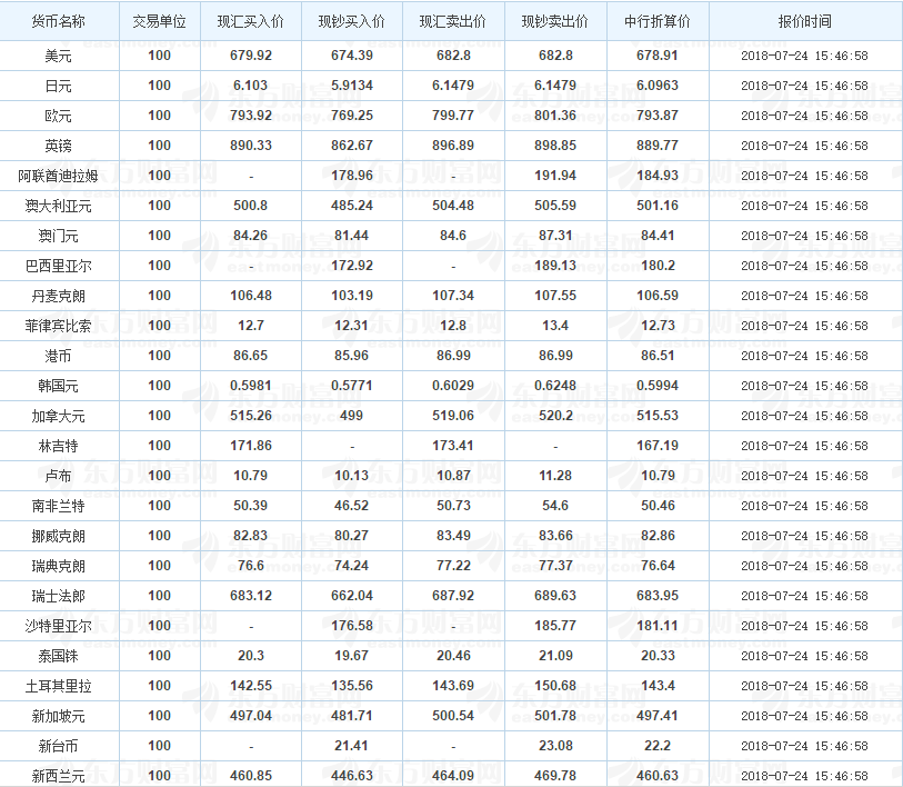 中国银行外汇牌价 2018-07-24(图片来源:东方财富网)