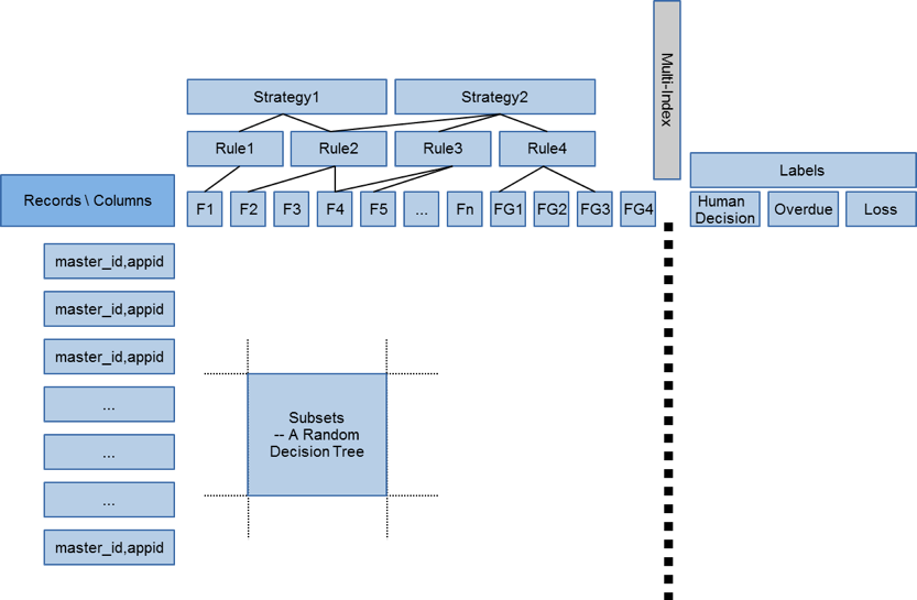 考虑到人工管理和优化规则的困难,本文从算法优化的角度探讨一种可行的人工+机器学习的方案。使用了规则引擎的企业,其规则已经以结构化的形式存在于数据库中,这使得算法优化成为一种可能。本文仍然以信贷审批的场景为例,假设数据库中所有的数据已经整合成了一张数据表(可能是一张维度非常多的表),表中的每一行代表一个人(或一次申请),每一列代表一个判别属性(变量),其中有一些特殊的列(标签列)包含了人工决策,逾期表现,损失等与决策和业务KPI相关的指标。我们希望算法优化的结果总是好于人工决策的,这样用算法优化的结果就可以直接导入业务系统执行。