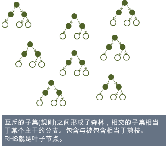 每条规则可以分为LHS(Left Hand Side)和RHS(Right Hand Side)两部分,其中LHS相当于规则的条件或者说前件,LHS相关的变量组成了一个变量集合,而RHS则是满足LHS规则所采取的行为。如果规则间的变量集合是不相交,那么规则是互相独立的,可以视为两颗决策树;如果是相交的,则可以整合为一颗决策树。