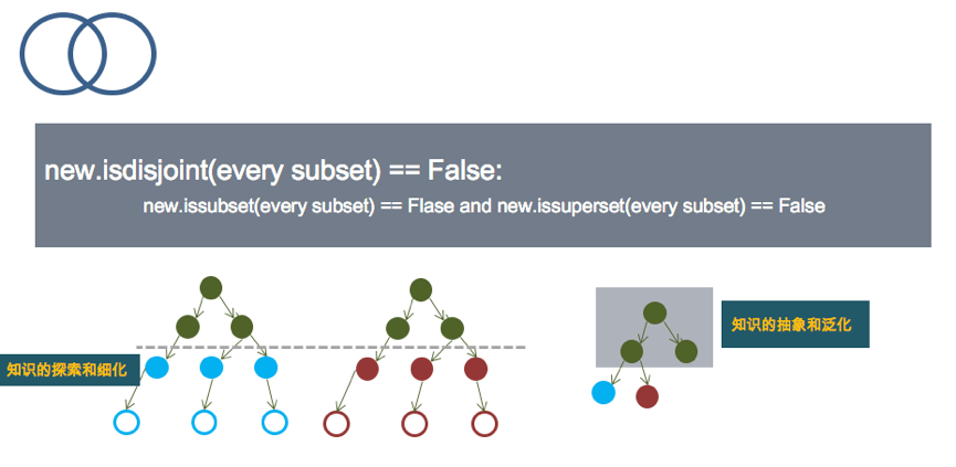 如图3,分歧是指新加入的规则变量集合与某棵树的变量集合相交,不同的变量元素(蓝点和红点)称为分歧。其本质是加入额外的判别信息后,决策结果可能会不同,从知识的角度理解,也可以视为是一种细化的差异。