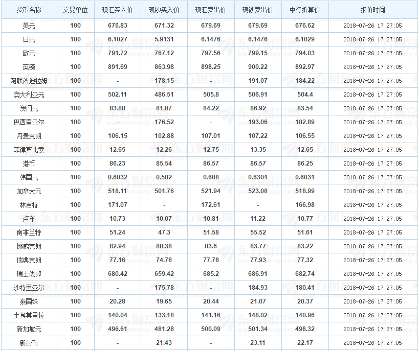 中国银行外汇牌价 2018-07-26(图片来源:东方财富网)