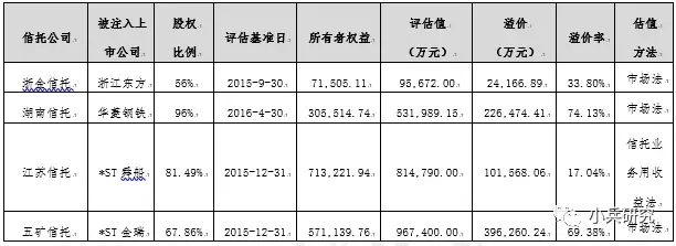 据上市的公告,这五家信托公司股权的估值大部分为市场法,四家信托中溢价率最高的为湖南信托,其信托业务主要认政府委托标为主,风险相对比较低,近年也表现出比较高的盈利能力;溢价率最低是为江苏信托,仅为17.04%。