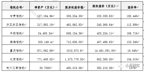 我们可以看出挂牌的股权溢价率低至29.75%,高则达100.48%,大部分在[50%,100%]区间,当然这不是最终成交价,但至少可以反映出信托公司股权转让方的底线。