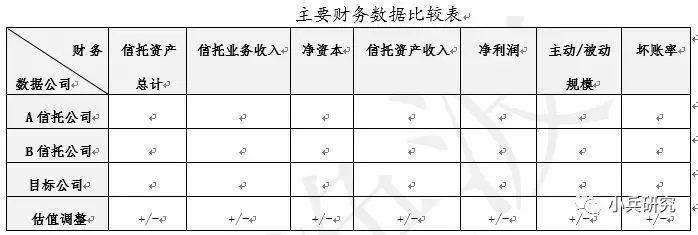 举个例子。首先,截至评估基准日,我们通过公开信息收集了X家近期来信托行业股权转让等交易案例进行比较分析,从交易时间上筛选,剔除了交易时间相对比较早的某些案例;其次,以业务规模为核心,兼顾盈利能力、增值能力、成长能力的评价体系进行可比性分析,再次剔除不满足可比性、充分性的交易案例。